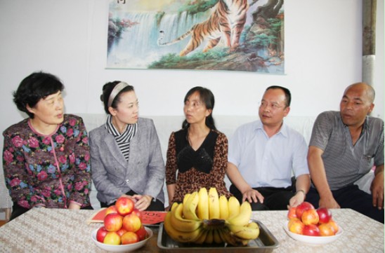 中國婦女發(fā)展基金會(huì )副秘書(shū)長(cháng)朱錫生(右二)、青海省婦聯(lián)副主席謝瓊(左一)、方正集團副總裁兼首席品牌官魏亞歐(左二)一同看望郭玉蓮夫婦。郭玉蓮(中),樂(lè )都縣碾伯鎮土橋村宮頸癌患者。出院以來(lái),身體素質(zhì)和精神恢復情況尚可,但目前無(wú)法正常從事體力勞動(dòng)。