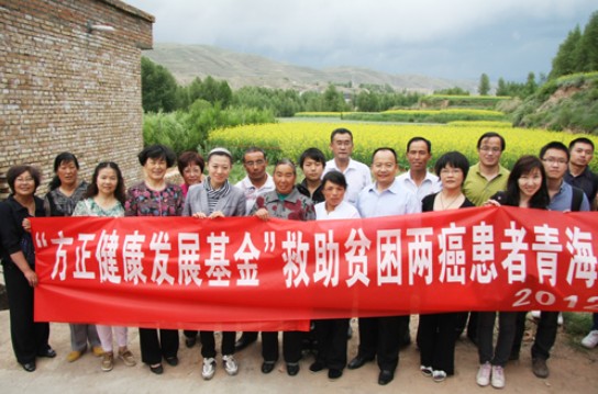 “方正健康發(fā)展基金”救助貧困“兩癌”患者青海省回訪(fǎng)團一行合影。